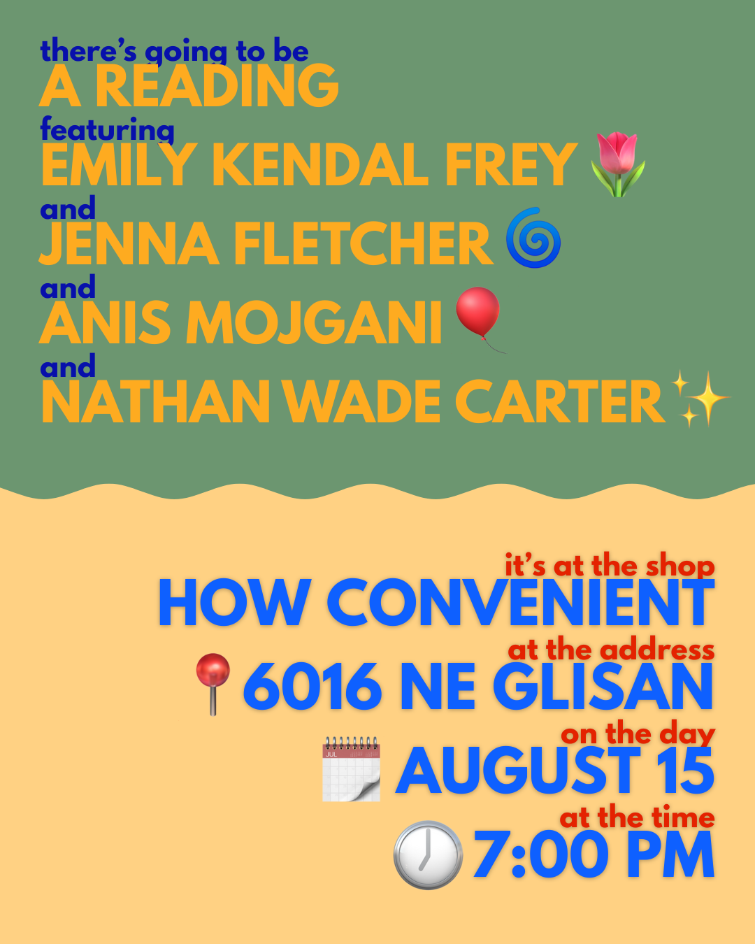 Hosted by the incomparable Frayn Masters (BACKFENCE Storytelling), I’ll be reading alongside Olufunke Grace Bankol, Olufunke Grace Bankolee, Holly Brickley, Jon Raymond, Lisa Wells, and Brianna Wheeler